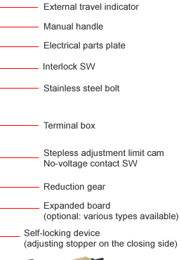 2 Switches, each for open / closing positions (no-voltage contact SWs for stop and signals at fully-open and fully-closed ends). Contact capacity: 250 VAC, 11 A (Resistance load)